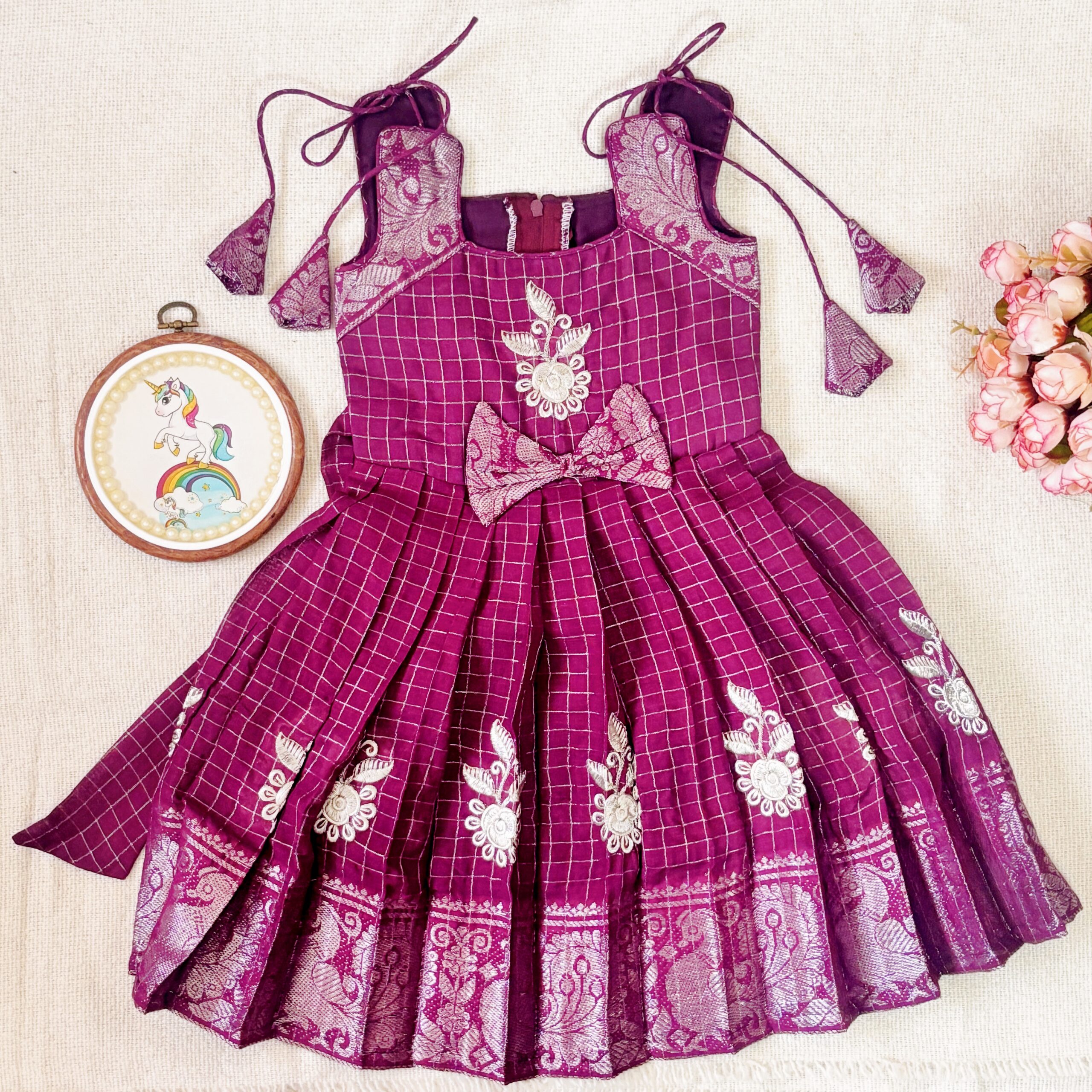 Plum-purple kids dress with floral embroidery, zari border, and waist bow—perfect for festive occasions.